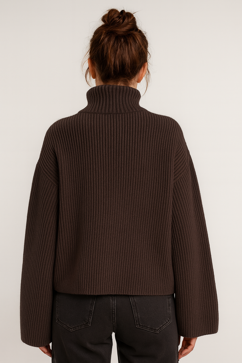 Ten kardigan wykonany jest w ciemnym odcieniu i posiada prążkowaną strukturę na całej powierzchni. Model wyposażony jest w wysoki kołnierz oraz zapięcie na zamek błyskawiczny z przodu. Długie rękawy i prosty dół nadają całości prosty, wykończony wygląd. Odpowiedni na chłodniejsze dni oraz różne codzienne okazje.