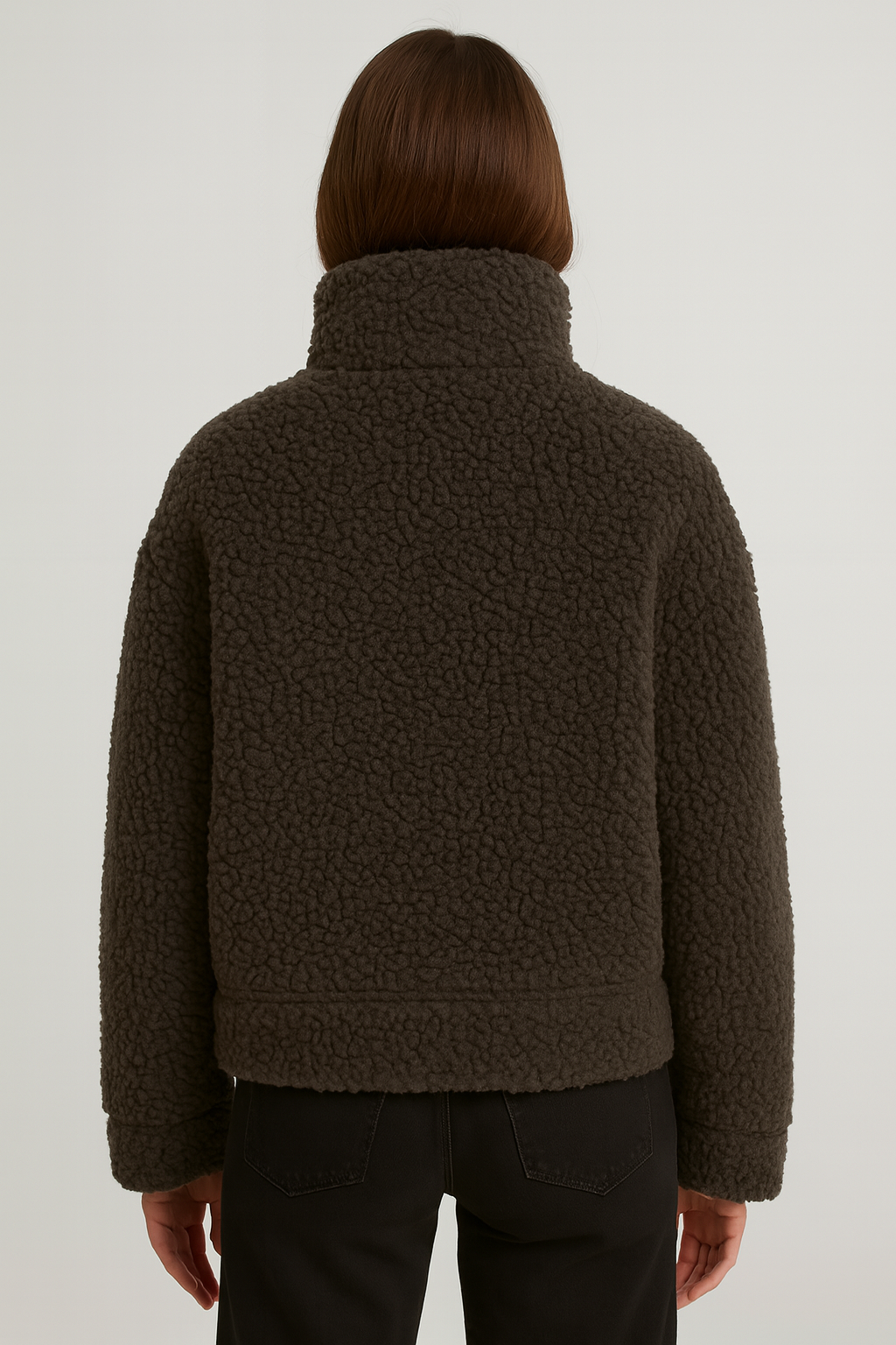 Ten płaszcz wykonany jest w ciemnym odcieniu i posiada puszystą, obszerną strukturę przypominającą sztuczne futro. Model ma wysoki kołnierz oraz zapięcie umieszczone centralnie z przodu. Płaszcz jest odpowiedni do noszenia w chłodniejsze dni i można go łączyć z różnymi codziennymi stylizacjami.