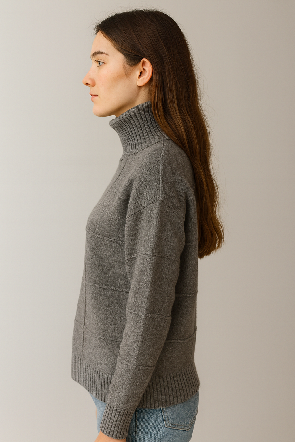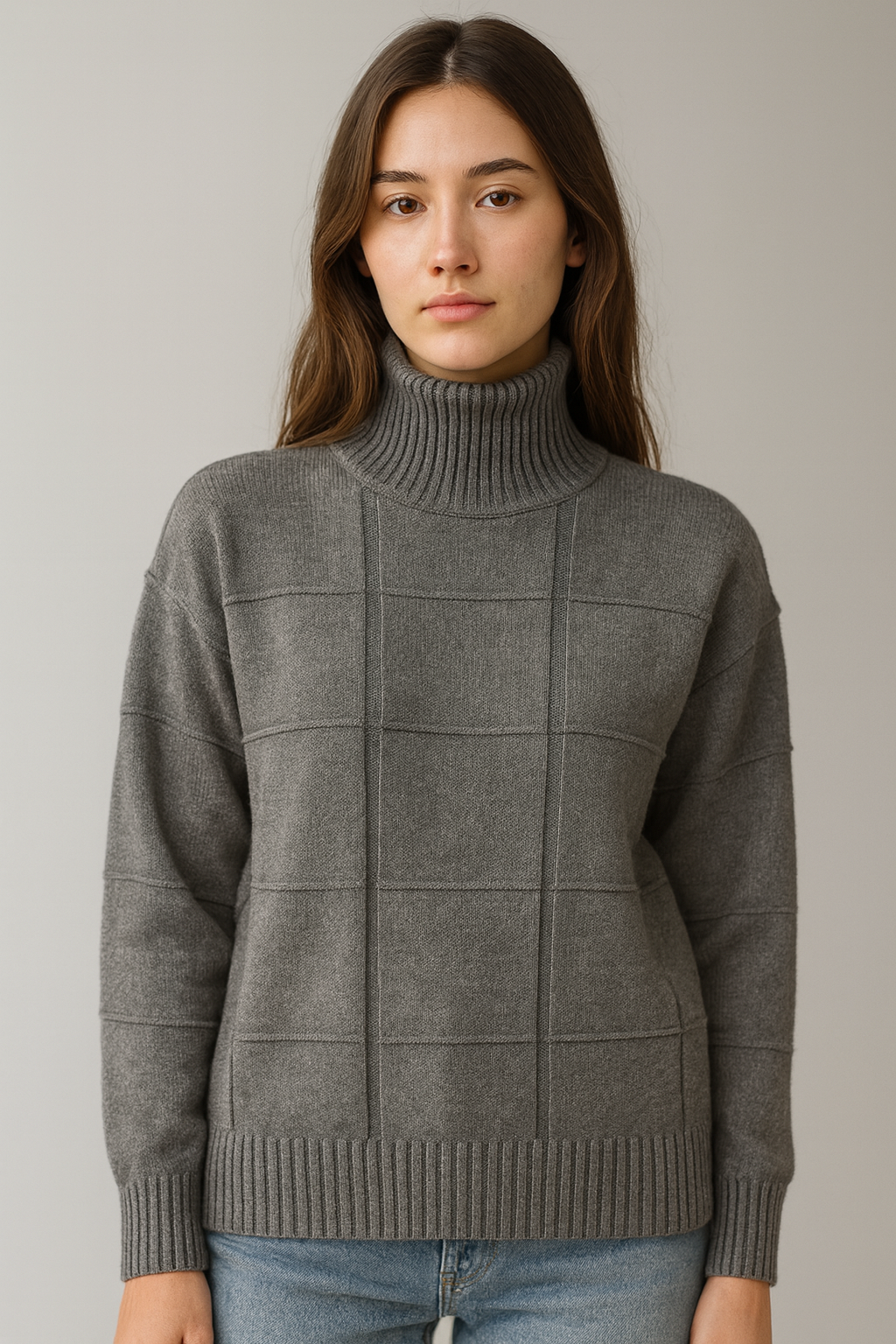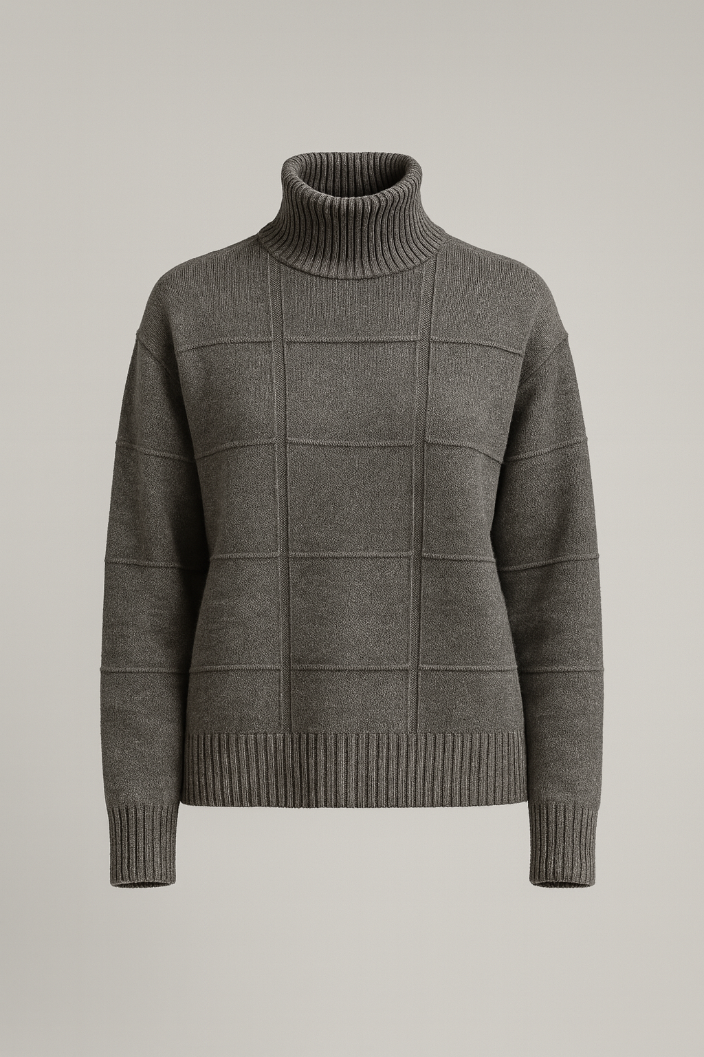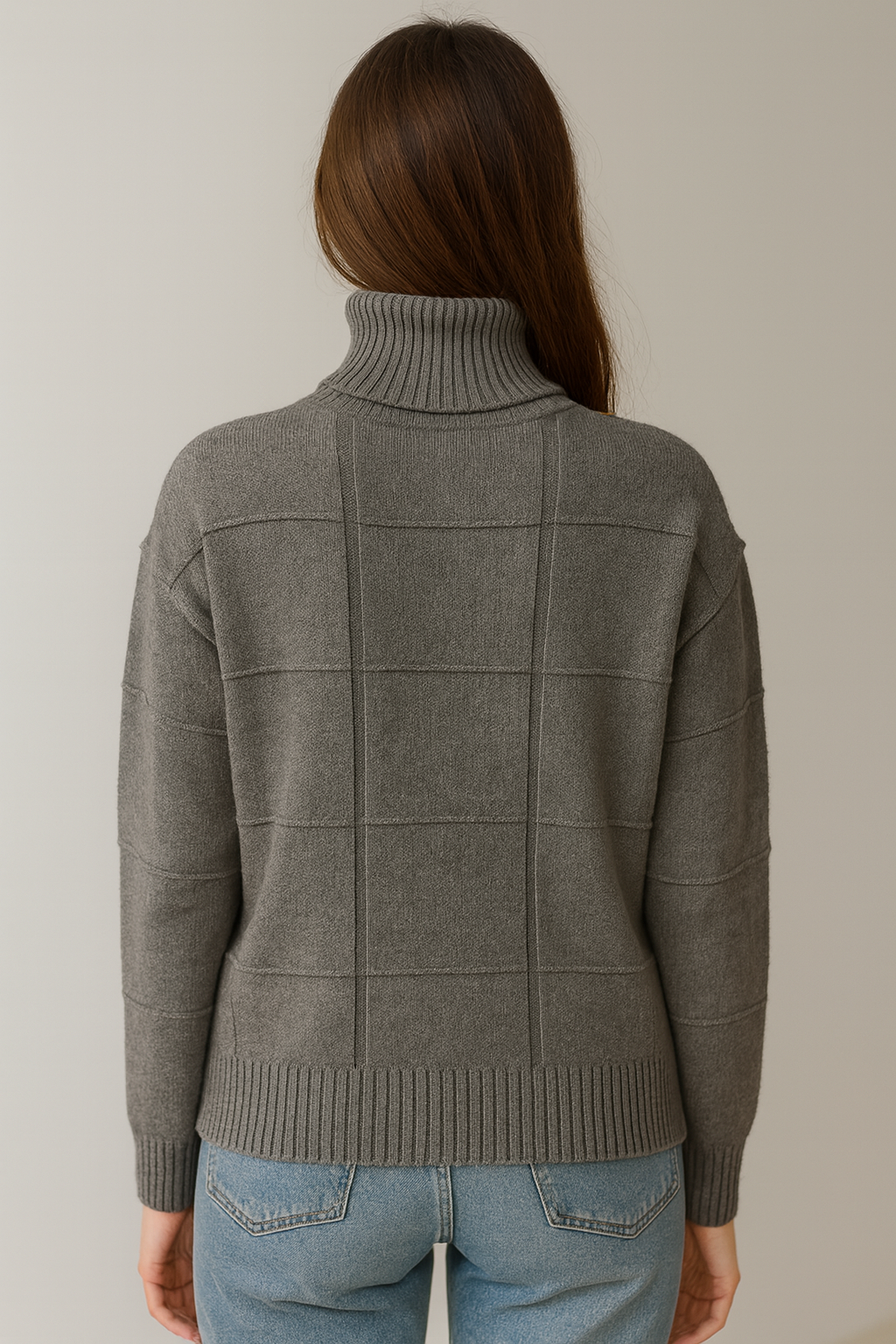 Ten sweter wykonany jest w szarym odcieniu i posiada wysoki golf o prążkowanej strukturze. Model ma wzór z wplecionymi liniami na przodzie oraz długie rękawy. Prosty dół i prążkowane wykończenia nadają swetrowi schludny wygląd. Odpowiedni na chłodniejsze dni oraz różne codzienne okazje.